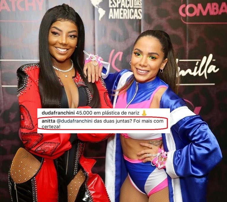 Recentemente, Anitta divulgou uma foto em que aparece ao lado de Ludmilla, e mostrou que está bem atenta ao que as pessoas estão comentando. Um internauta resolveu falar sobre o preço das plásticas no nariz das duas cantoras e recebeu uma resposta lacradora.
