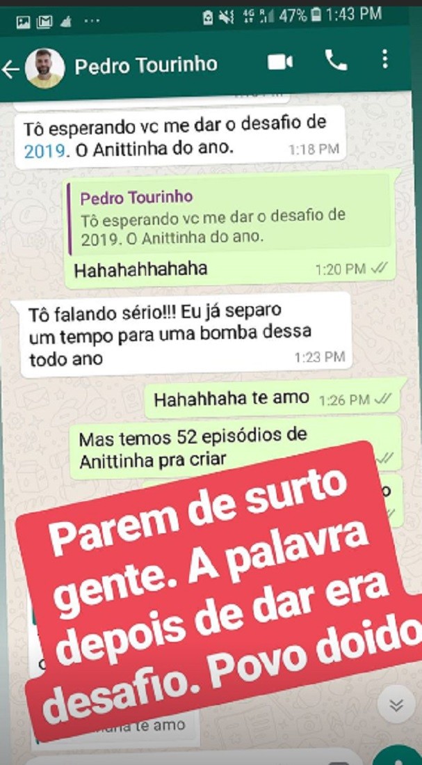Ao perceber a repercussão que o caso tomou, Anitta voltou a se pronunciar, divulgando no Stories a conversa com Pedro, que diz: “Tô esperando você me dar o desafio de 2019. O Anittinha do ano”. A cantora escreveu: “Parem de surto! A palavra depois de dar era desafio. Povo doido”.