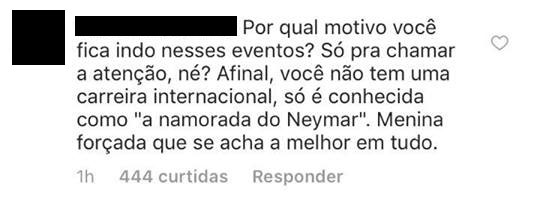 “Por qual motivo você fica indo nesses eventos? Afinal, você não tem nenhuma carreira internacional, só é conhecida como “namorada do Neymar”. Menina forçada que se acha a melhor em tudo”, atacou uma seguidora.