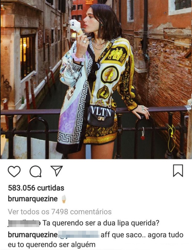 Bruna Marquezine já vem à tempos sendo comparada com a cantora Dua Lipa nas redes sociais, mas chegou uma hora para atriz que isso acabou irritando e chegou a responder um fã que a criticou. Aparentemente, a seguidora não foi a única que reclamou do clique pois, horas mais tarde, a atriz simplesmente apagou a publicação de sua timeline.