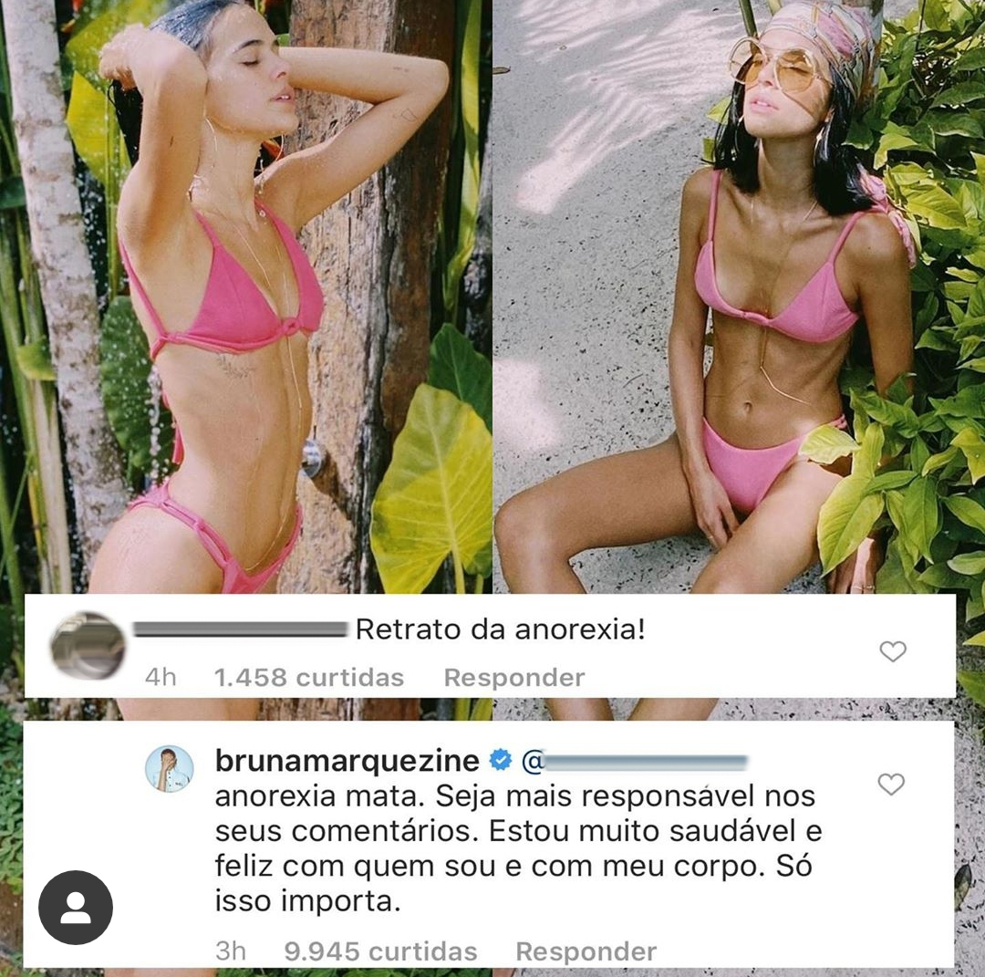 Como já era de se esperar, Bruna Marquezine não gostou nada do comentário maldoso e fez questão de responder à altura, mas dando um sermão na pessoa. “Anorexia mata. Seja mais responsável nos seus comentários. Estou muito saudável, feliz com quem sou e com meu corpo. Só isso importa”, rebateu a atriz.