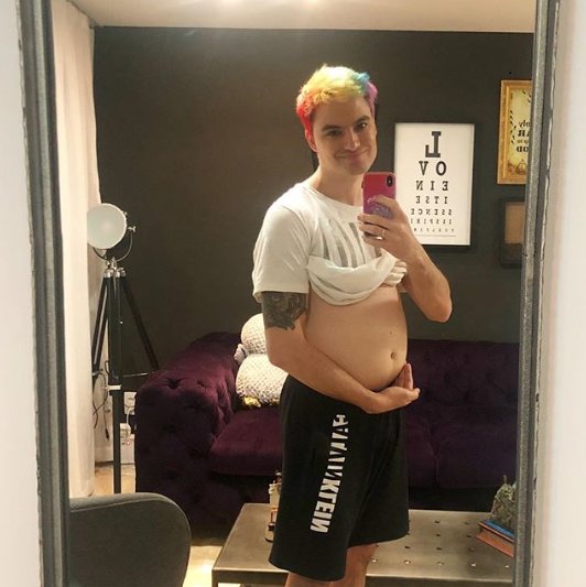 Felipe divulgou uma foto em que aparece mostrando a barriga e escreveu: “Quem quer arruma um jeito. Quem não quer arruma desculpa. Parece grávido mas é pizza. Tem gases tb”.