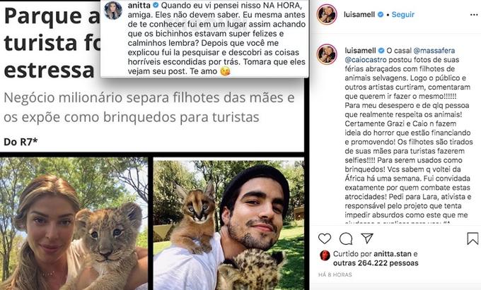 Nesta terça-feira (28), Anitta comentou a publicação de Luisa Mell, que criticou a visita de Caio Castro e Grazi Massafera a um parque africano que explora animais selvagens.