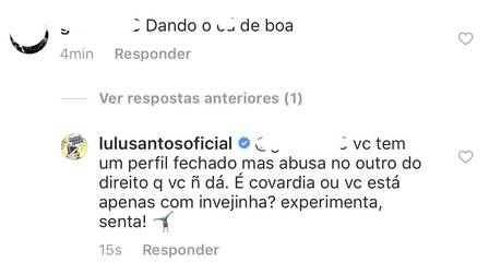 “Você tem um perfil fechado, mas abusa no outro do direito que você não dá. É covardia ou você está apenas com invejinha? Experimenta, senta!”, respondeu Lulu.