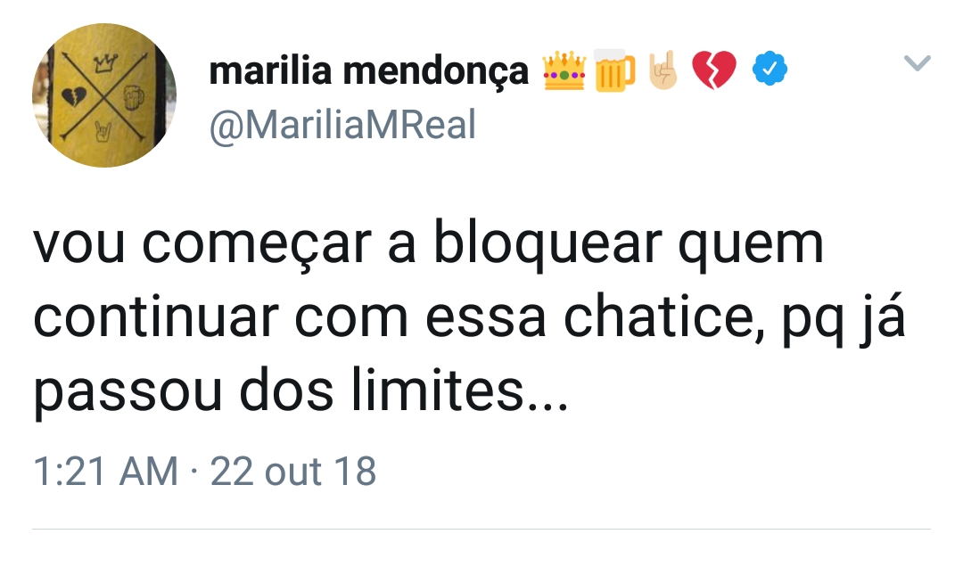 “Nossa, na moral, que negócio chato dos infernos! Vou começar a bloquear quem continuar com essa chatice, porque já passou dos limites”, escreveu no Twitter.