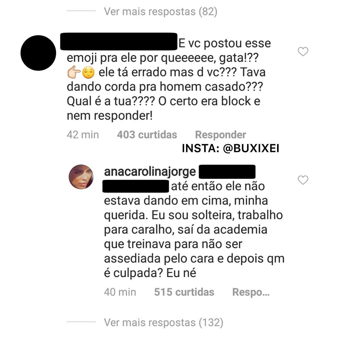Carolina respondeu: “Nossa, um desabafo de um segundo virou isso tudo. Eu tive que sair da academia que eu treinava para não ser cantada por ele todo dia. Motivo suficiente ou quer mais?”.