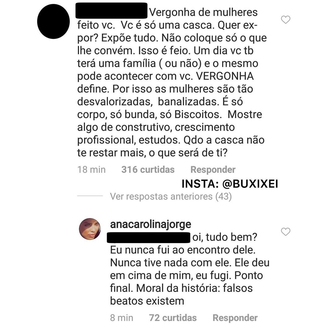 Quando foi acusada por uma terceira de querer “biscoito”, ela disparou: “Oi, tudo bem? Eu nunca fui ao encontro dele. Nunca tive nada com ele. Ele deu em cima de mim, eu fugi. Ponto final. Moral da história: falsos beatos existem.”.