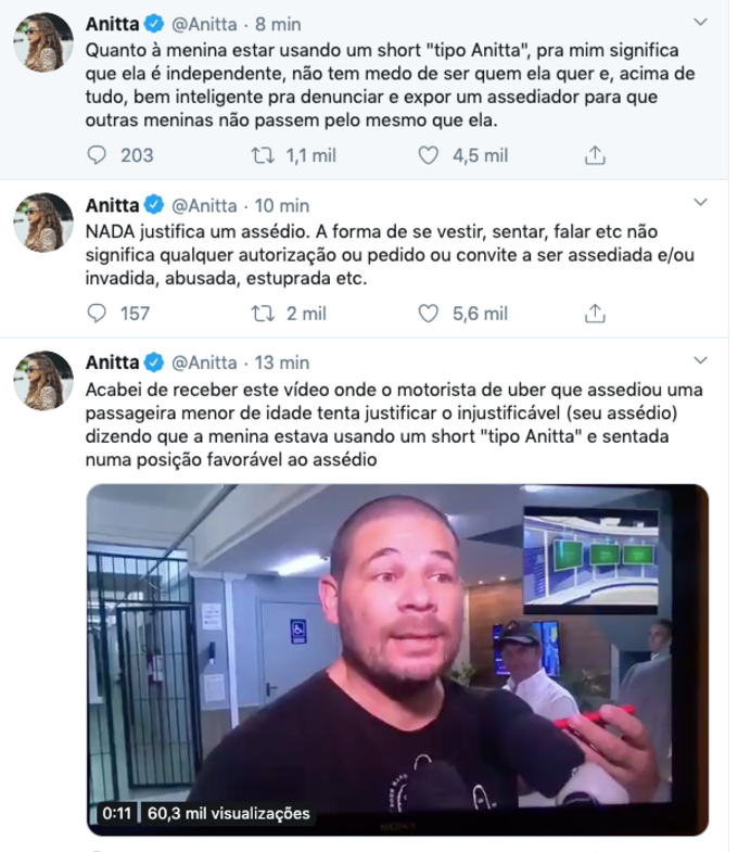 “Acabei de receber este vídeo onde o motorista de uber que assediou uma passageira menor de idade tenta justificar o injustificável (seu assédio) dizendo que a menina estava usando um short “tipo Anitta” e sentada numa posição favorável ao assédio”, escreveu ela no Twitter.