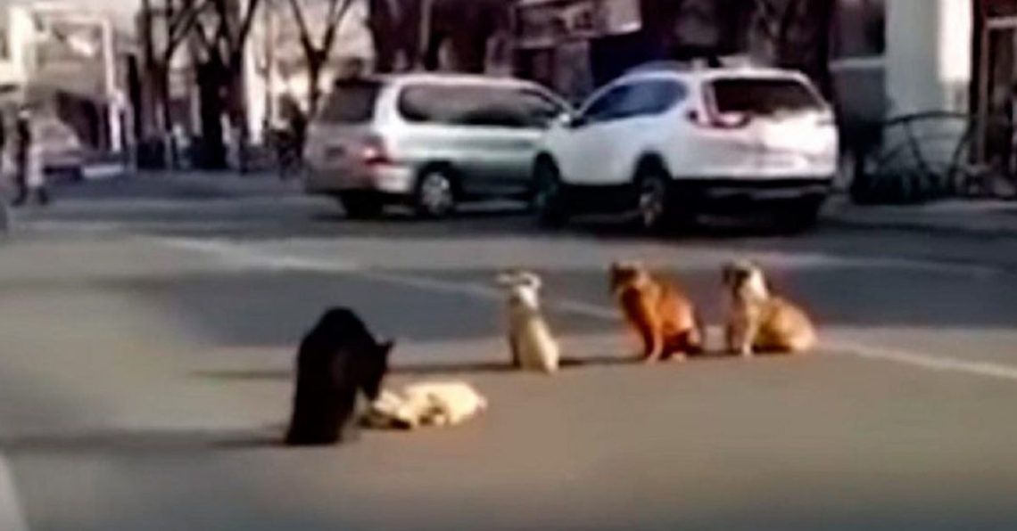 O acontecido foi em Lanzhou, na China Central. O cães cercaram o seu amigo assim que ele foi atropelado, para proteger o amigo dos carros que passavam por ali como uma barreira, tentando também o despertar.